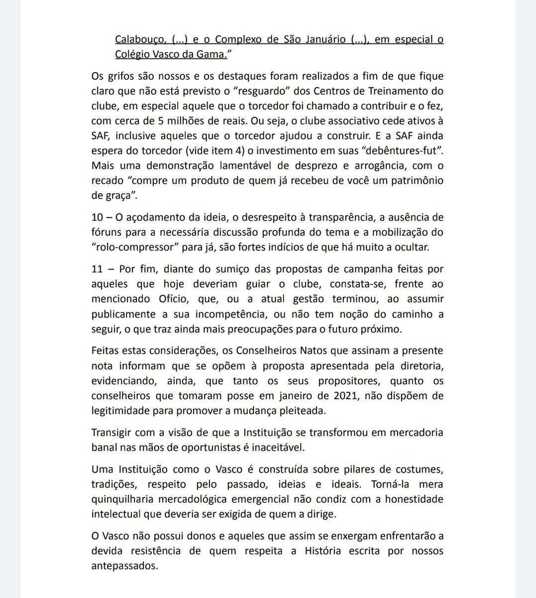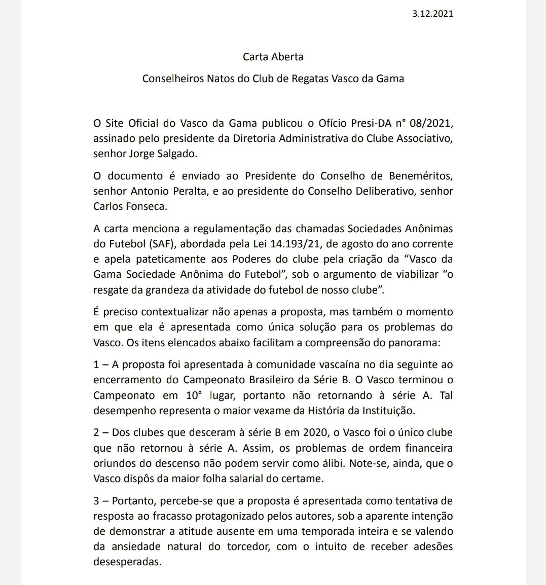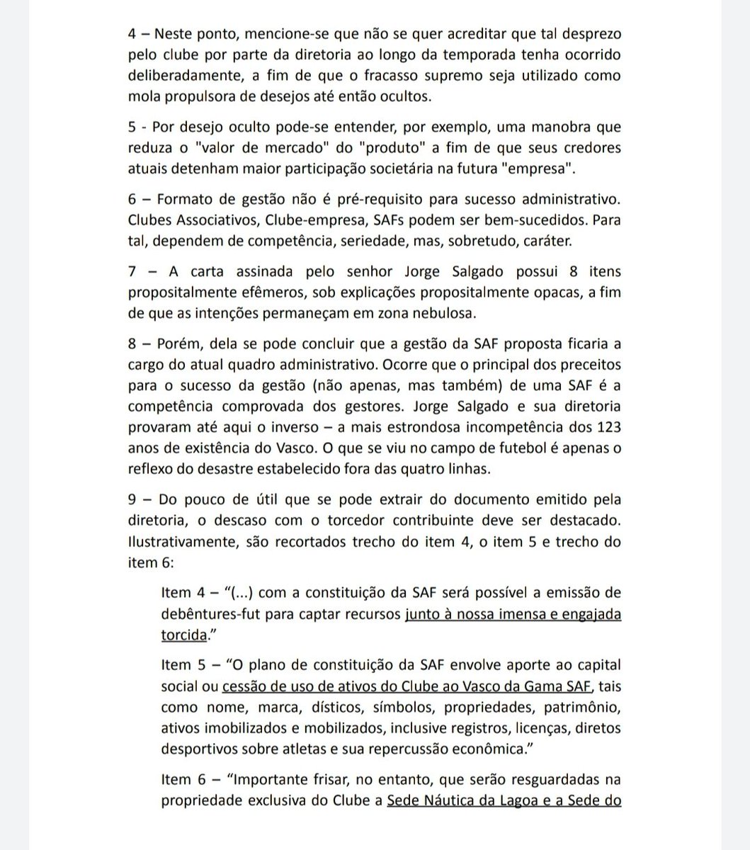 O documento publicado nesta sexta afirma que a movimentação para se criar uma SAF um dia após o término da Série B, em que o Vasco ficou em 10º lugar, é uma "tentativa de resposta ao fracasso protagonizado pelos autores, sob a aparente intenção de demonstrar a atitude ausente em uma temporada inteira e se valendo da ansiedade natural do torcedor, com o intuito de receber adesões desesperadas".