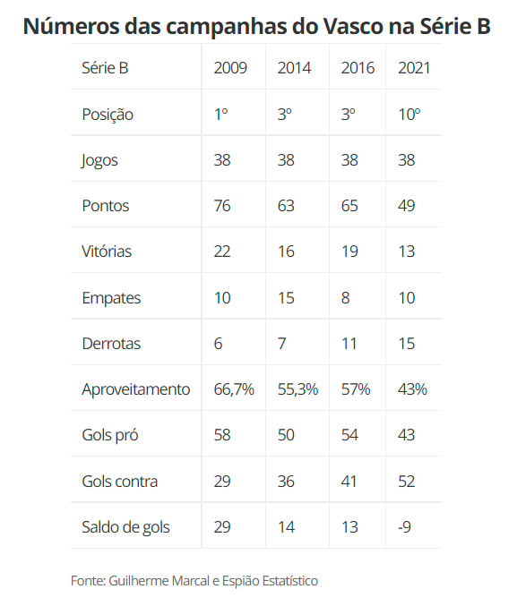 O levantamento do Espião Estatístico ilustra como foi a trajetória do Vasco em todas as campanhas na Série B. Os números que mais chamam atenção são os da quantidade de gols sofridos e da quantidade de gols feitos, um desequilíbrio enorme entre ataque e defesa que culminou na permanência do clube na segunda divisão. Esta foi a única vez em que o clube não conseguiu o acesso para a Série A.