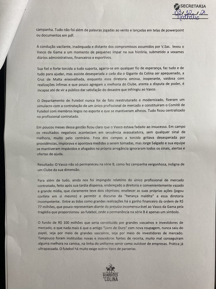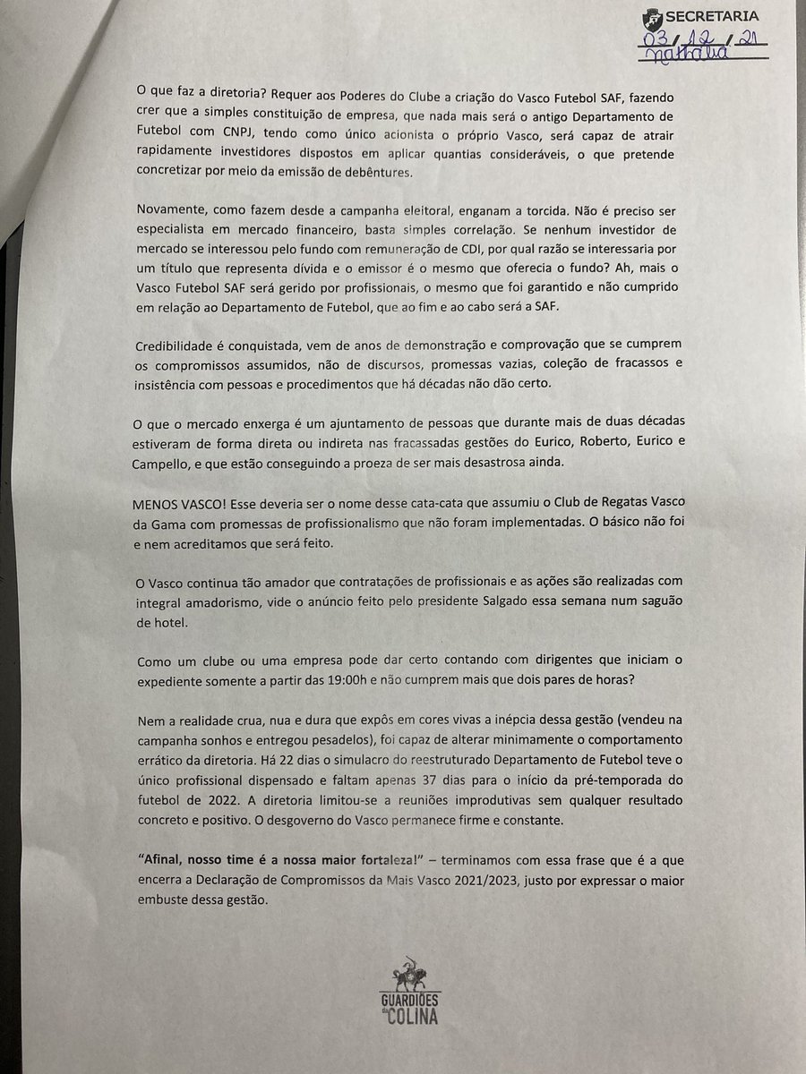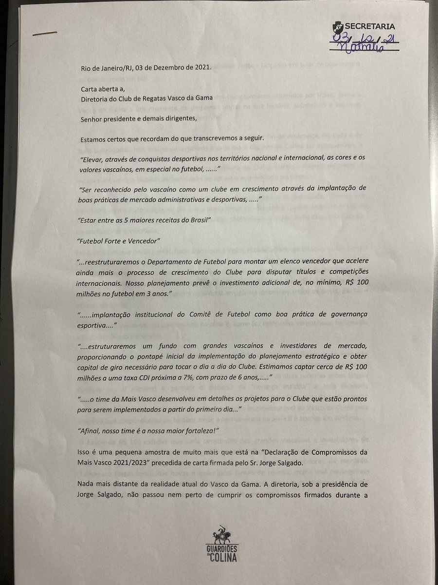 Cumprindo o compromisso de estar sempre presente e atuante em defesa do Vasco da Gama, o grupo Guardiões da Colina, protocolou ontem, uma carta aberta à diretoria do clube, analisando e confrontando: Compromissos firmados x Realizações entregues.