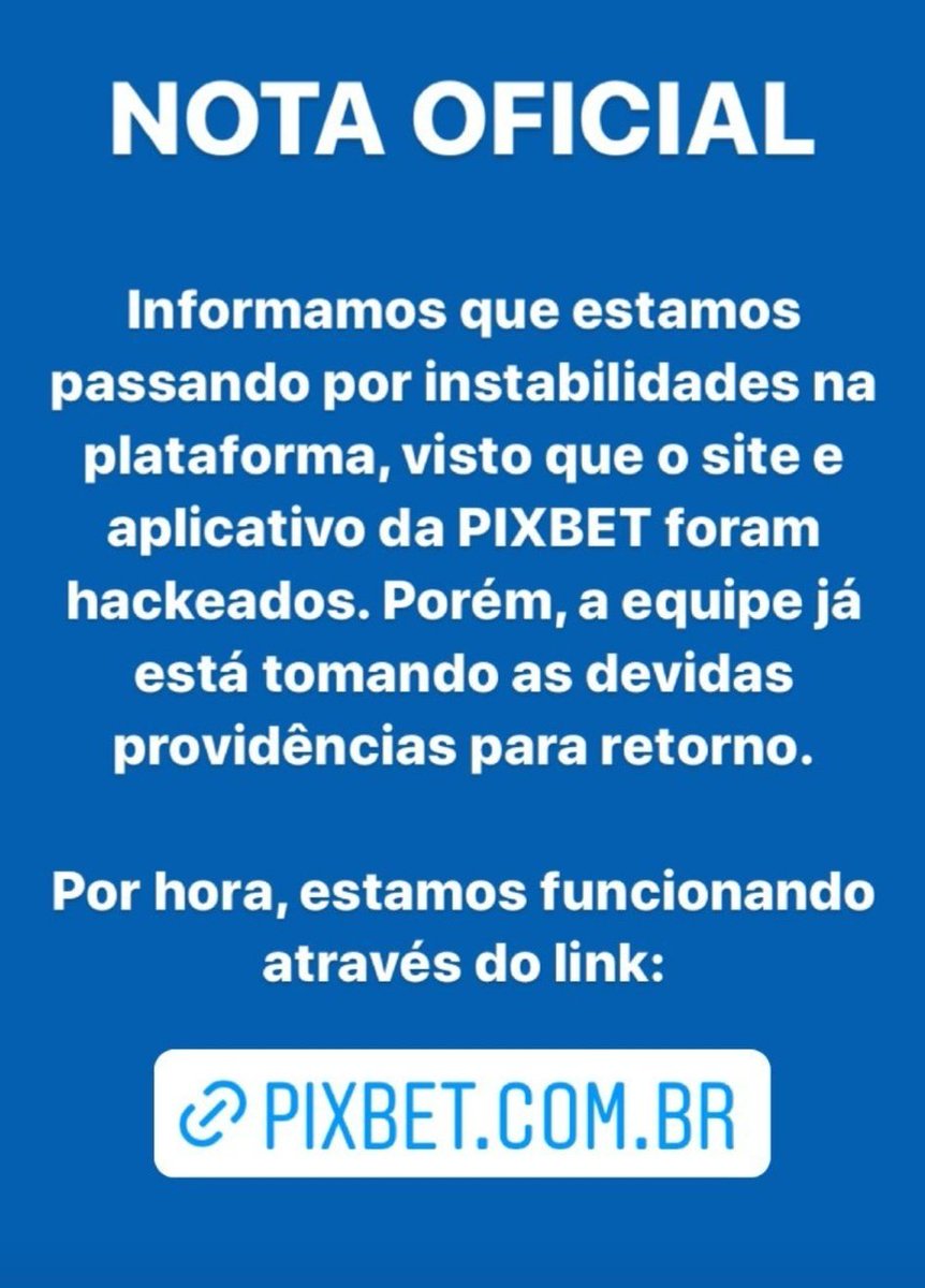 Nota oficial da Pixbet sobre o ataque de hackers sofrido em seu site.