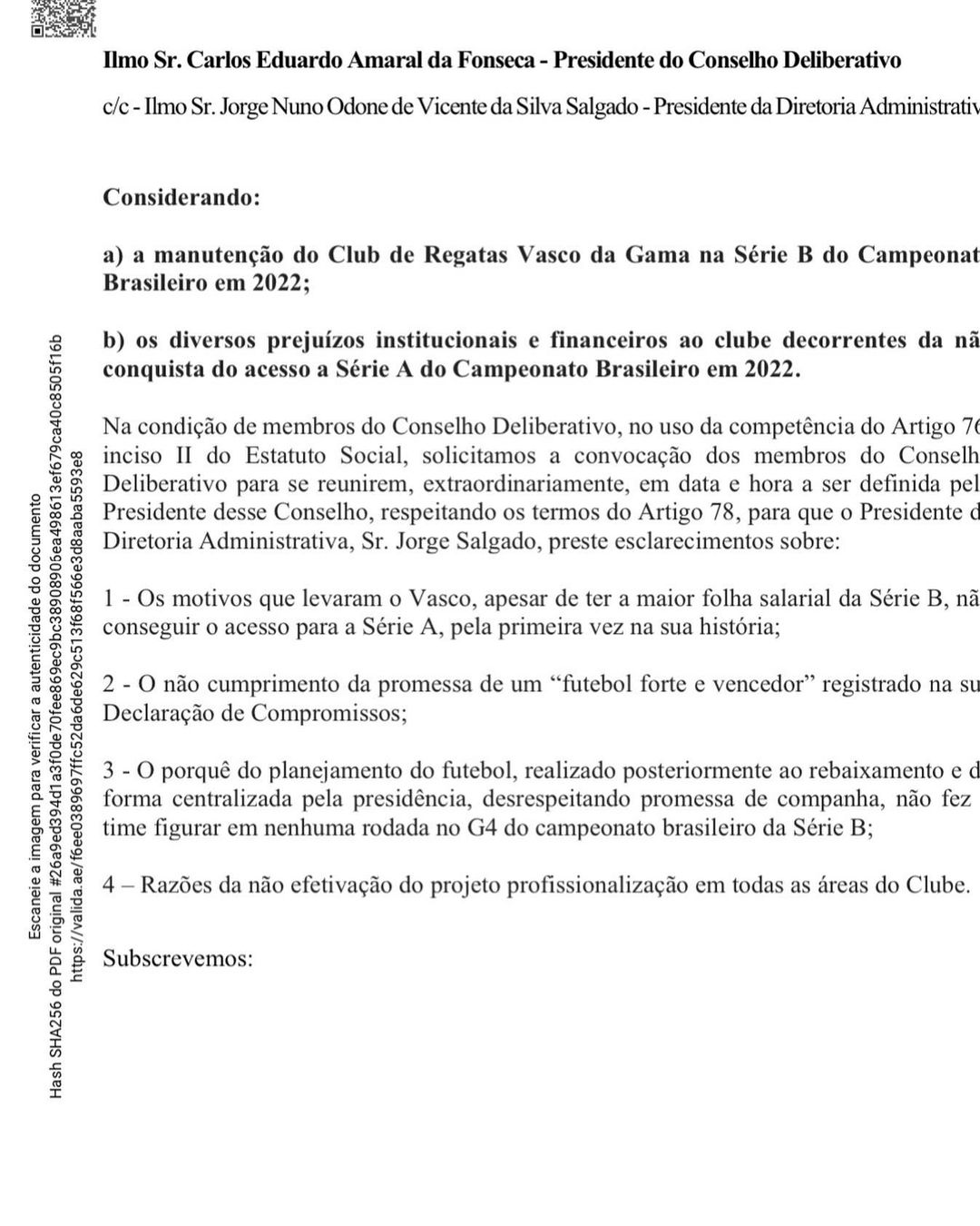 A Sempre Vasco, grupo político de Julio Brant, conseguiu reunir 65 assinaturas para convocar Jorge Salgado para dar explicações no Conselho Deliberativo sobre o fracasso do futebol em 2021. A carta foi protocolada na tarde desta segunda-feira, em São Januário. Constam na lista as assinaturas de 31 conselheiros, além de 34 beneméritos. O pedido é para que Carlos Fonseca, presidente do CD, convoque sessão extraordinária com a presença do presidente do Vasco.