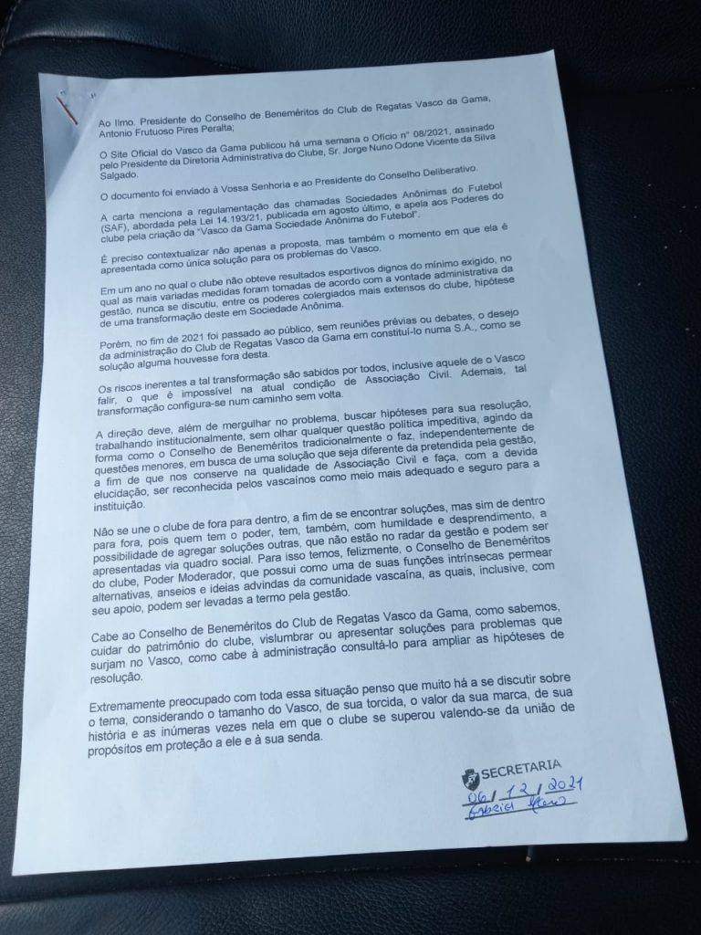 A carta menciona a regulamentação das chamadas Sociedades Anônimas do Futebol (SAF), abordada pela Lei 14.193/21, publicada em agosto último, e apela aos Poderes do clube pela criação da "Vasco da Gama Sociedade Anônima do Futebol".