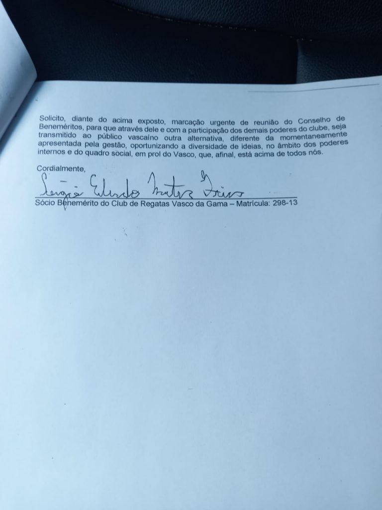 Na manhã desta segunda-feira (06/12), o benemérito Sérgio Frias protocolou carta na Secretaria do Vasco solicitando que o Presidente do Conselho de Beneméritos convoque reunião urgente para tratar sobre soluções alternativas à SAF.