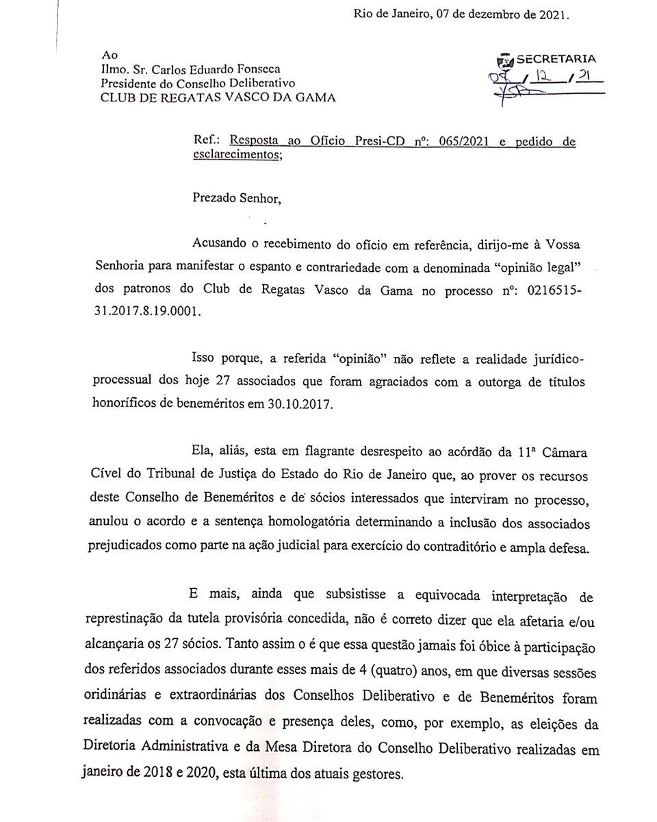 O presidente do Conselho de Beneméritos do Vasco, Antonio Peralta, registrou carta, na tarde sesta quarta-feira, fortemente contrário à nota de Carlos Fonseca, presidente do Conselho Deliberativo do clube. #lanceVAS