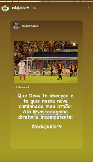Contratado pelo Cruzeiro, Edu reposta story em que torcedor chama diretoria do Vasco de incompetente