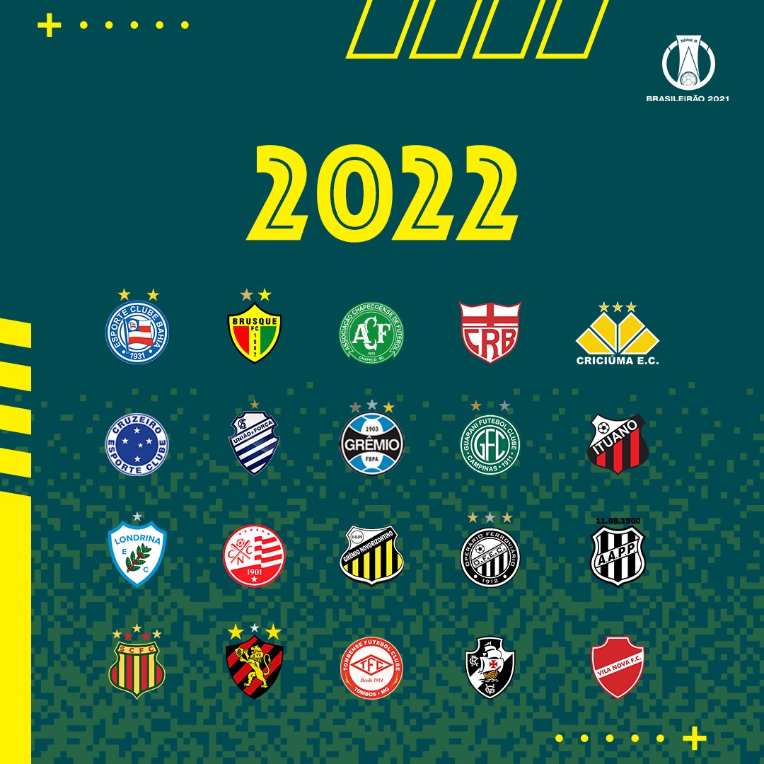 Com o fim do Brasileiro da Série A 2021 (e os rebaixamentos de Grêmio e Bahia na última rodada), ficaram definidos os 20 times que disputarão a Série B de 2022. Veja a lista abaixo. A letra entre parênteses indica a série que o respectivo clube disputou em 2021.