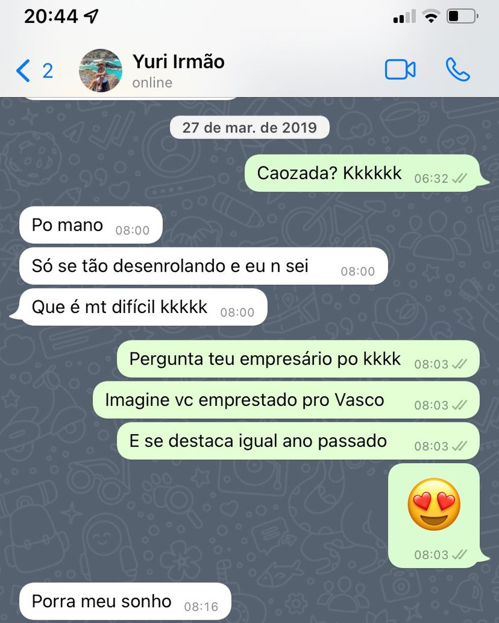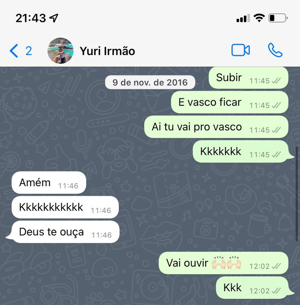 A vontade de ver o primo no Vasco é antiga. Luís tem registros de conversas no WhatsApp em 2016 e 2019, quando os dois brincavam e comentavam no aplicativo de mensagem sobre o sonho de Yuri jogar no clube do coração.