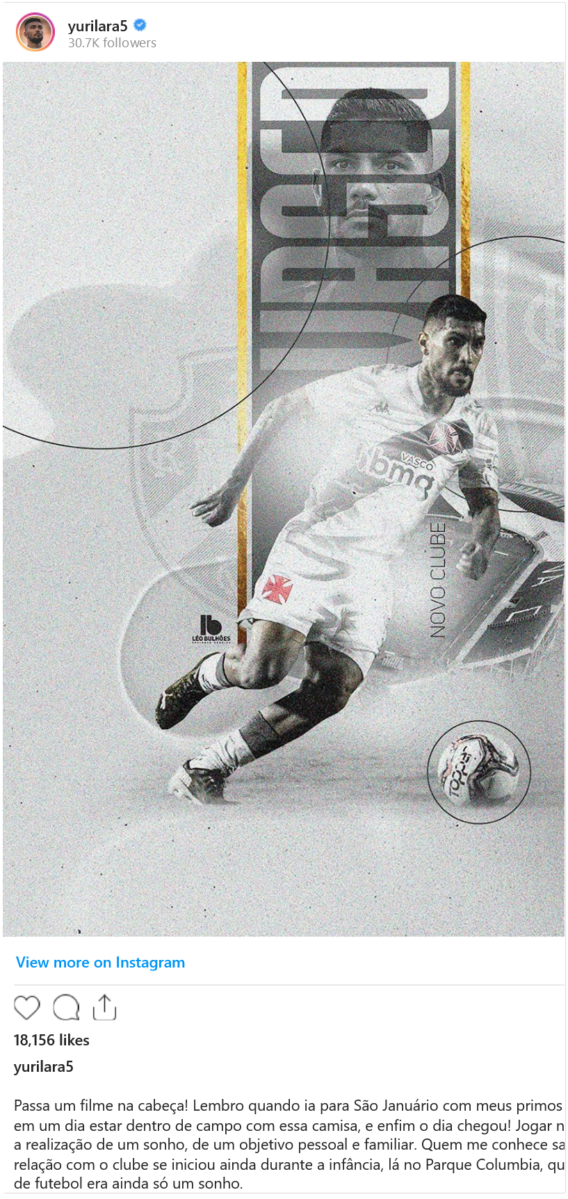 Yuri ainda não foi apresentado, mas postou nas redes sociais, após o anúncio, que um filme passou em sua cabeça e recordou de quando ia para São Januário torcer com seus primos e tios. O ge conversou com Luís Oliveira, primo muito próximo e companheiro de arquibancada, quando os dois eram mais novos. Além do parentesco, eles têm a mesma idade, foram criados juntos, vizinhos, no Parque Colúmbia, na Pavuna, Zona Norte do Rio de Janeiro. Luis considera Yuri seu irmão e ainda está tentando assimilar a contratação dele para o clube de coração.