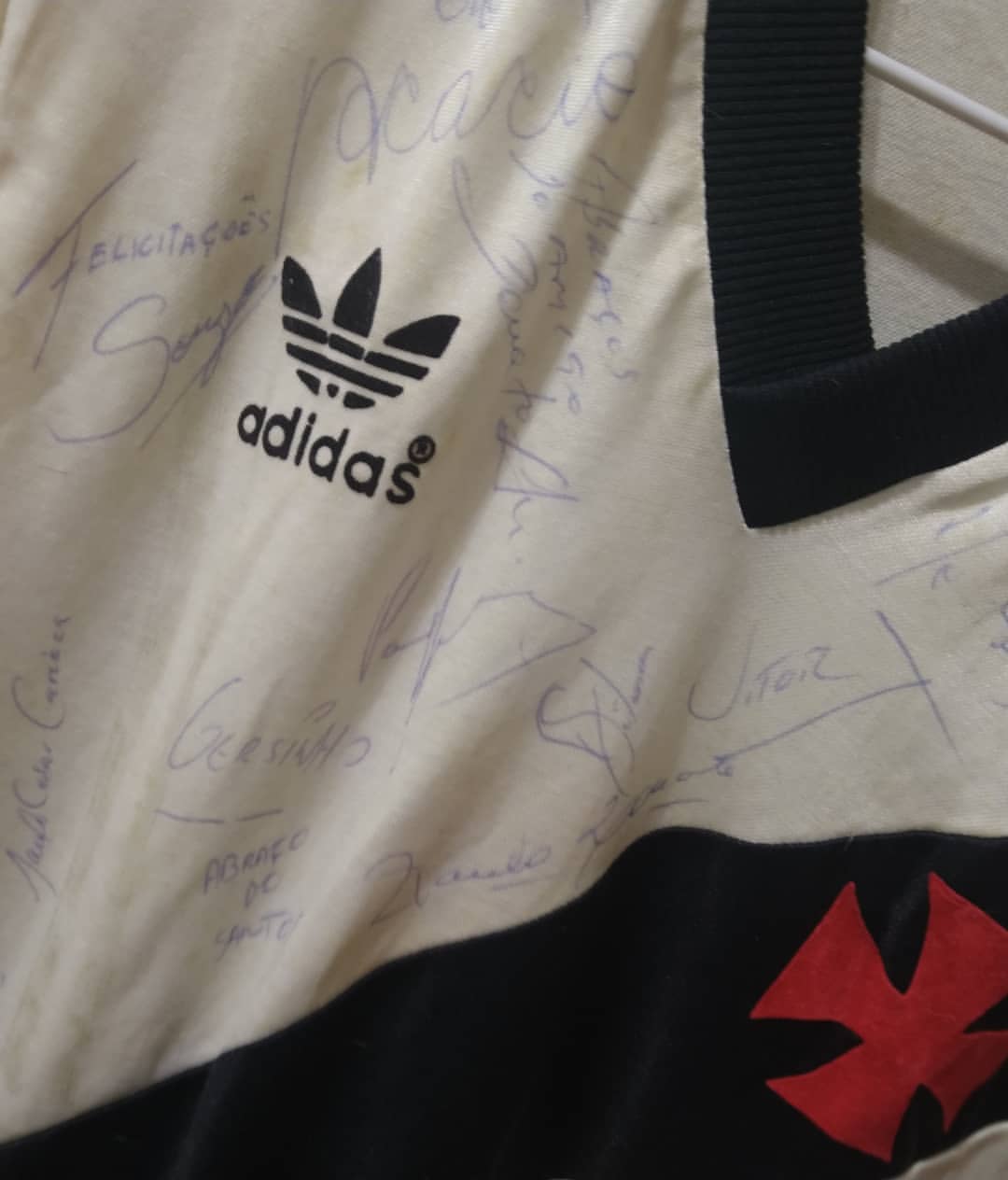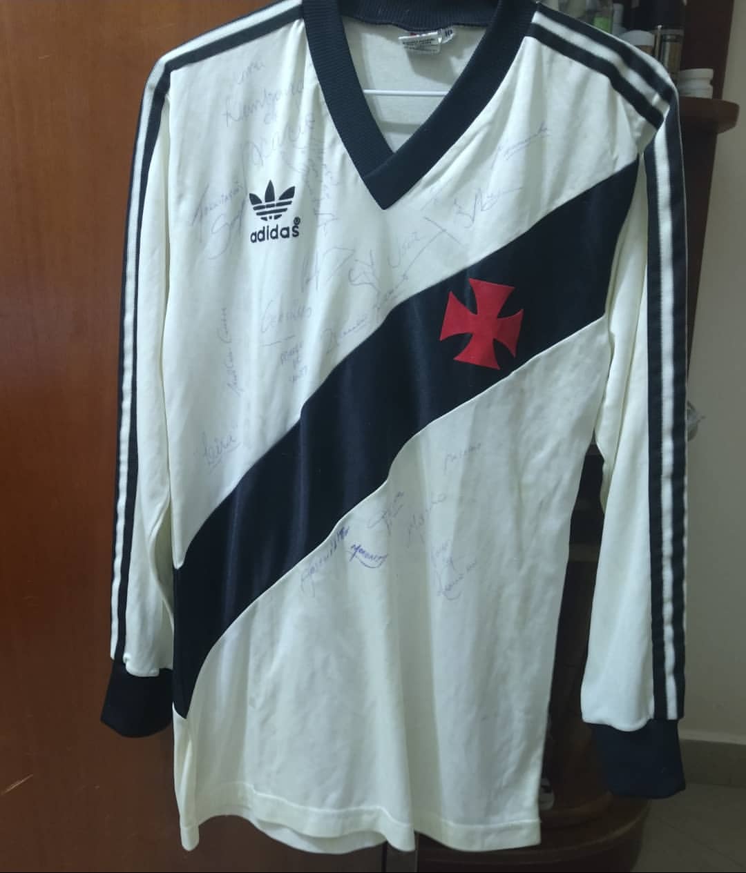 Bom dia a todos. E para fechar o ano , dizem que é bom passar de branco rsrs 😁. Essa blusa do Vasco , manga longa , chegou ontem. Resgatada pelo amigo Tavares para o nosso acervo . 1a etiqueta colorida , oq nos remete ao ano de 1985 🧐. E de brinde , a blusa veio toda autografada pelos jogadores deste ano😧 . Obrigado Tavares , parceria forte . Conte sempre comigo. Minha camisa , sua camisa , nossas camisas 🤜🤛