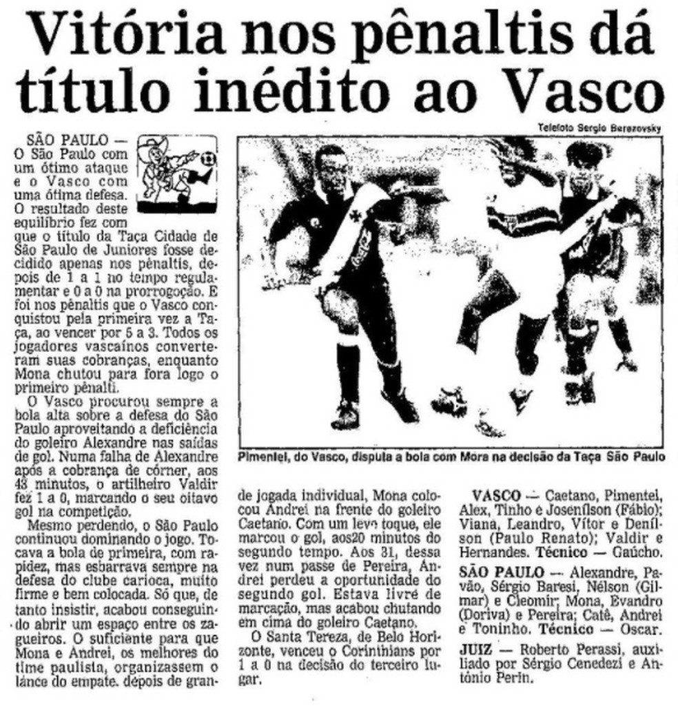 A partida ocorreu no dia do aniversário de São Paulo, em 25 de janeiro, no Pacaembu. O Vasco saiu na frente com Valdir, aos 43 do primeiro tempo, mas o São Paulo empatou com Mona, aos 20 da etapa final. A decisão, então, foi para os pênaltis. Vitor, Tinho, Leandro Ávila, Viana e Fábio convertam para o Vasco. Mona desperdiçou a primeira cobrança para o São Paulo. Doriva, Pereira e Gilmar fizeram o gol, mas a quinta cobrança não foi necessária. O título ficou com Vasco.