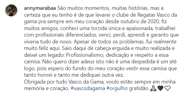 Destaque da categoria feminina do Vasco, a atacante Anny postou um texto de despedida do clube em seu Instagram.