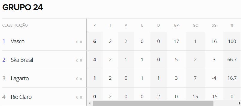 Terminada a 2ª rodada do Grupo 24 da Copa São Paulo de Futebol Júnior, o Vasco lidera com 6 pontos. Matematicamente classificado para a segunda fase após o empate entre Ska Brasil e Lagarto, o Gigante da Colina enfrentará o Ska Brasil na última rodada valendo a primeira colocação do grupo.