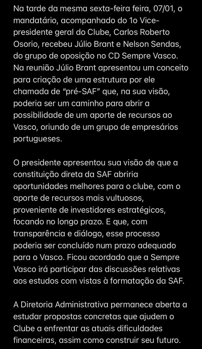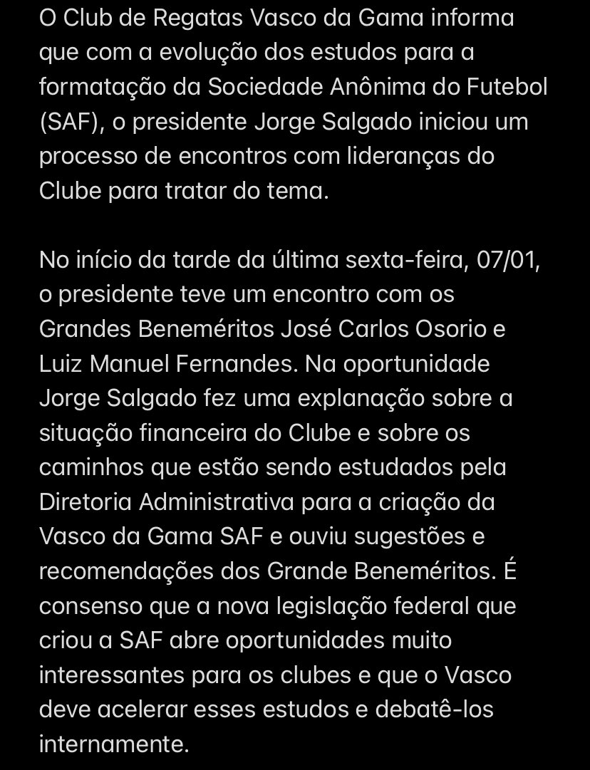Eu entrei em contato no começo da tarde com a assessoria do Vasco para saber o posicionamento de Jorge Salgado sobre a reunião. Segue a nota oficial do clube: