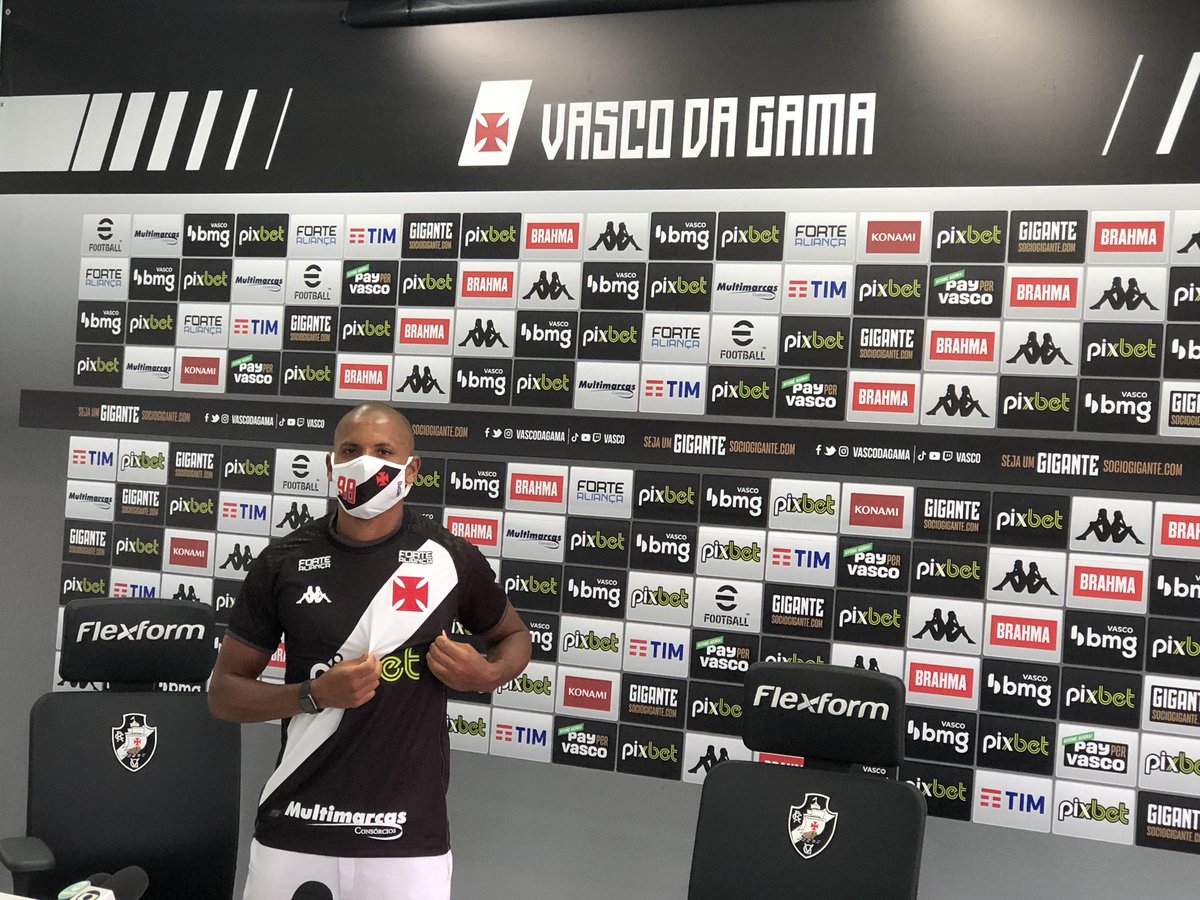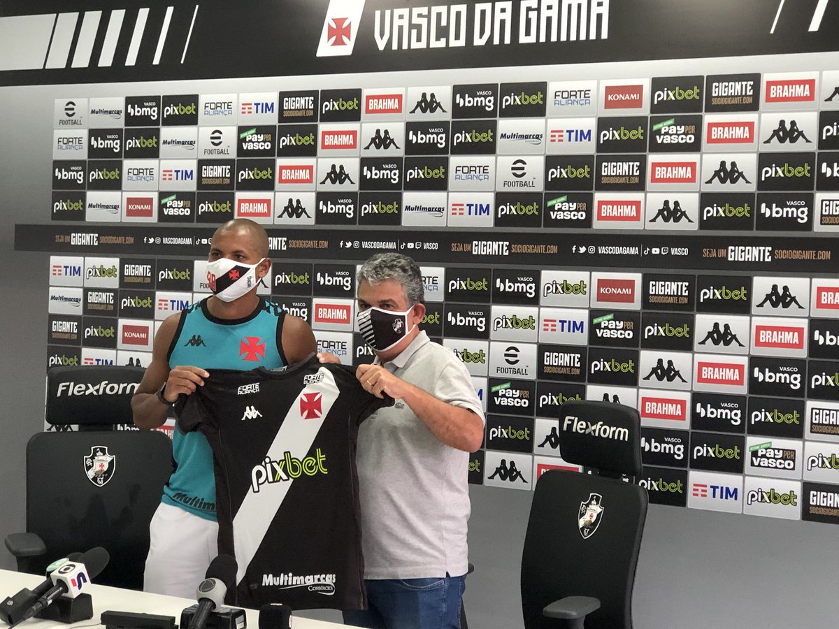 Lateral esquerdo Edimar é apresentado oficialmente pelo Vasco ao lado do gerente de futebol, Carlos Brazil, aqui no CT Moacyr Barbosa