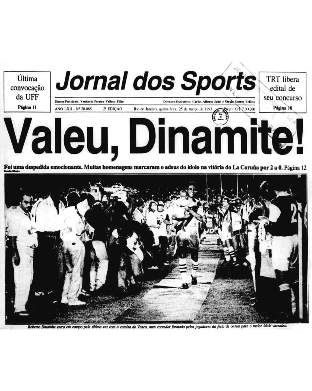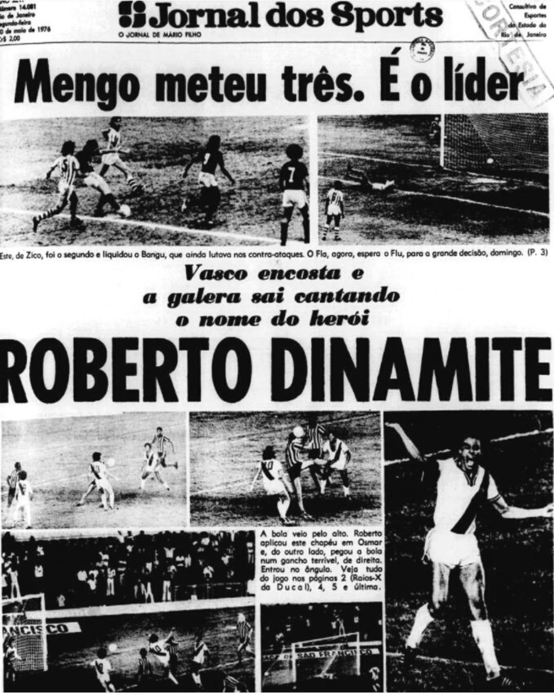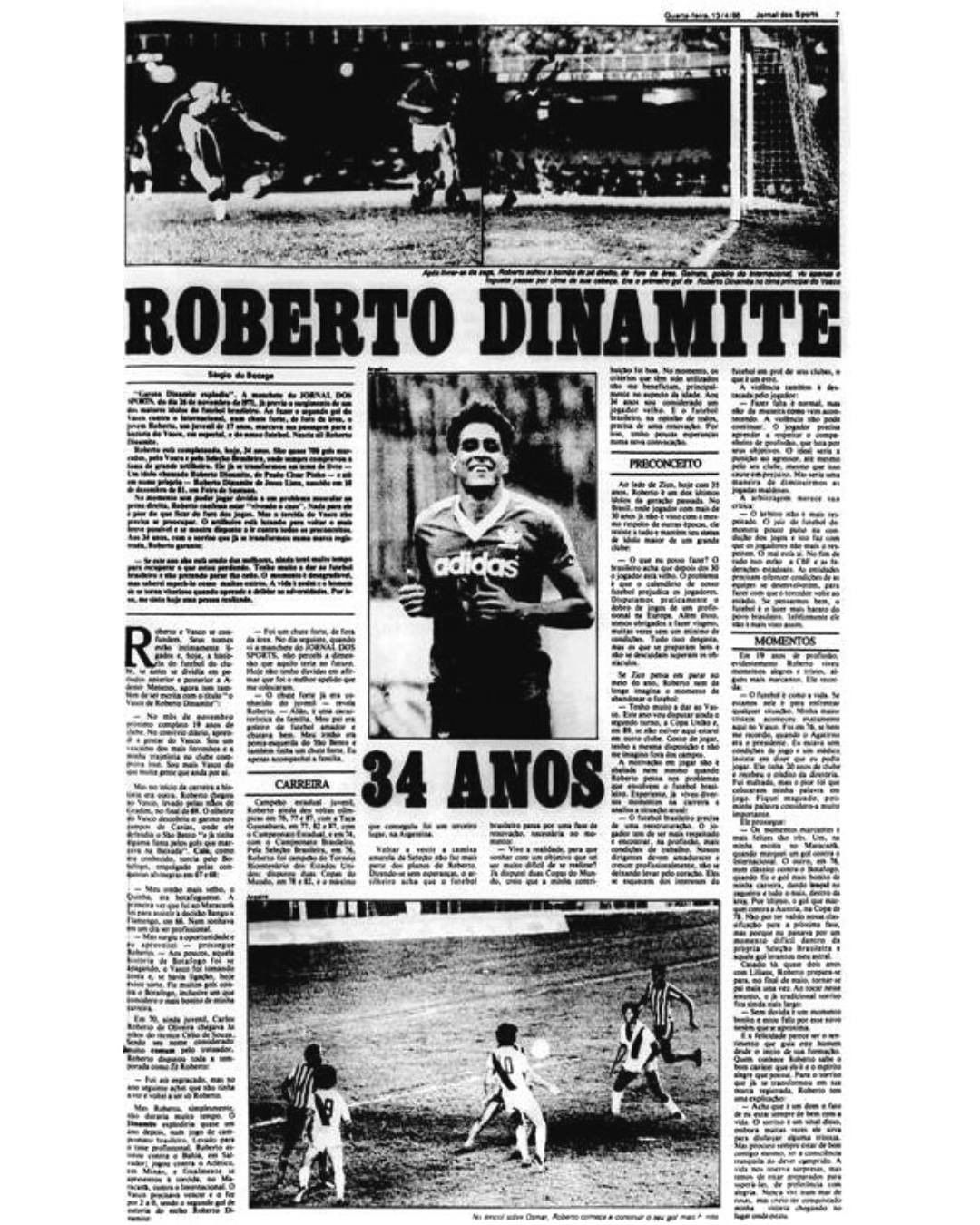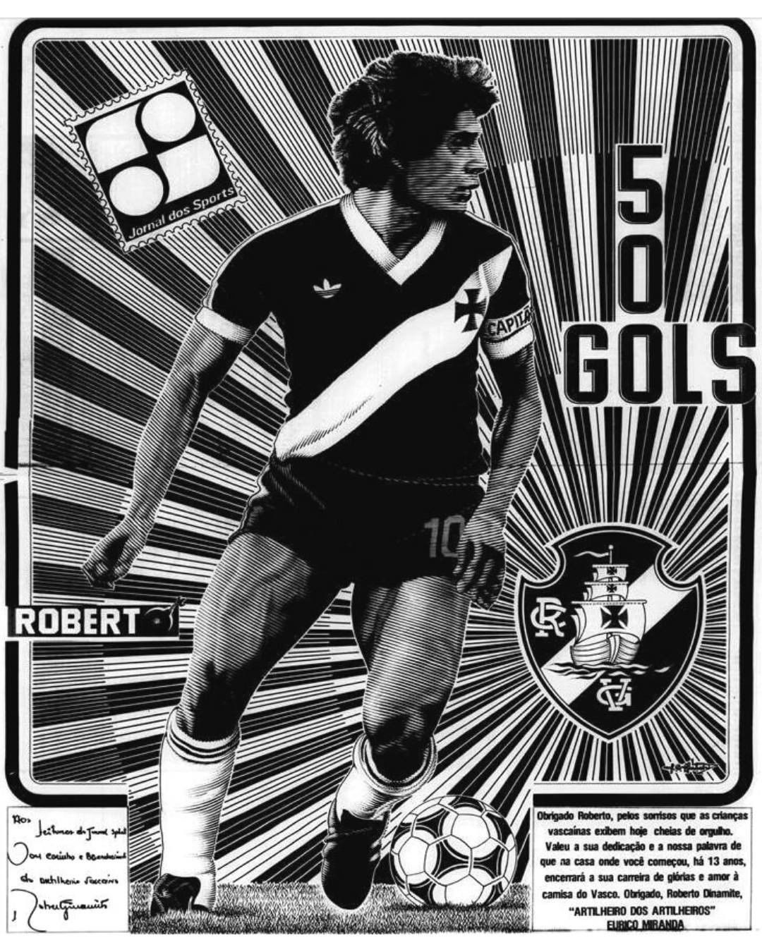 O atacante Roberto foi revelado pelo Vasco, mas Dinamite é cria do Jornal dos Sports. Afinal, foi de uma manchete das páginas rosas que surgiu o apelido do maior ídolo da história do Gigante da Colina. E, diante deste desafio complicado que o eterno artilheiro enfrenta, fica aqui nossa singela homenagem e o registro de momentos marcantes de sua carreira, nas páginas do JS.