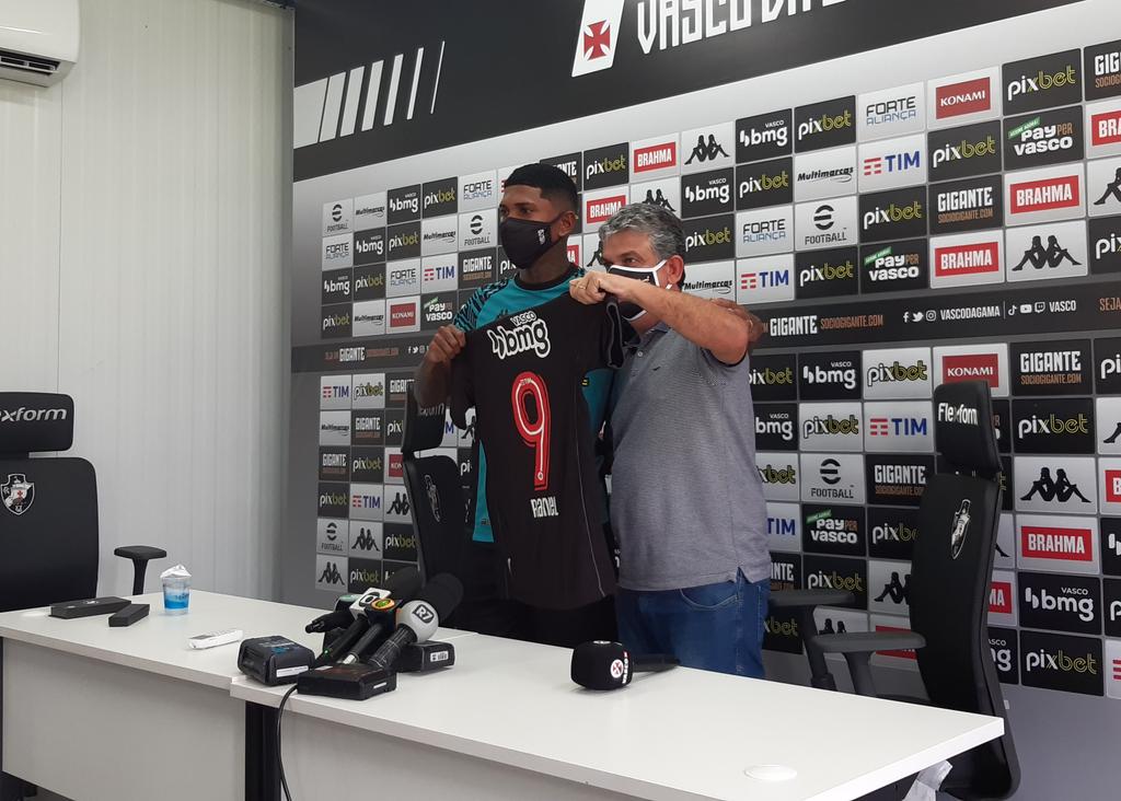 Atacante Raniel recebe a camisa 9 do Vasco das mãos do gerente de futebol, Carlos Brazil