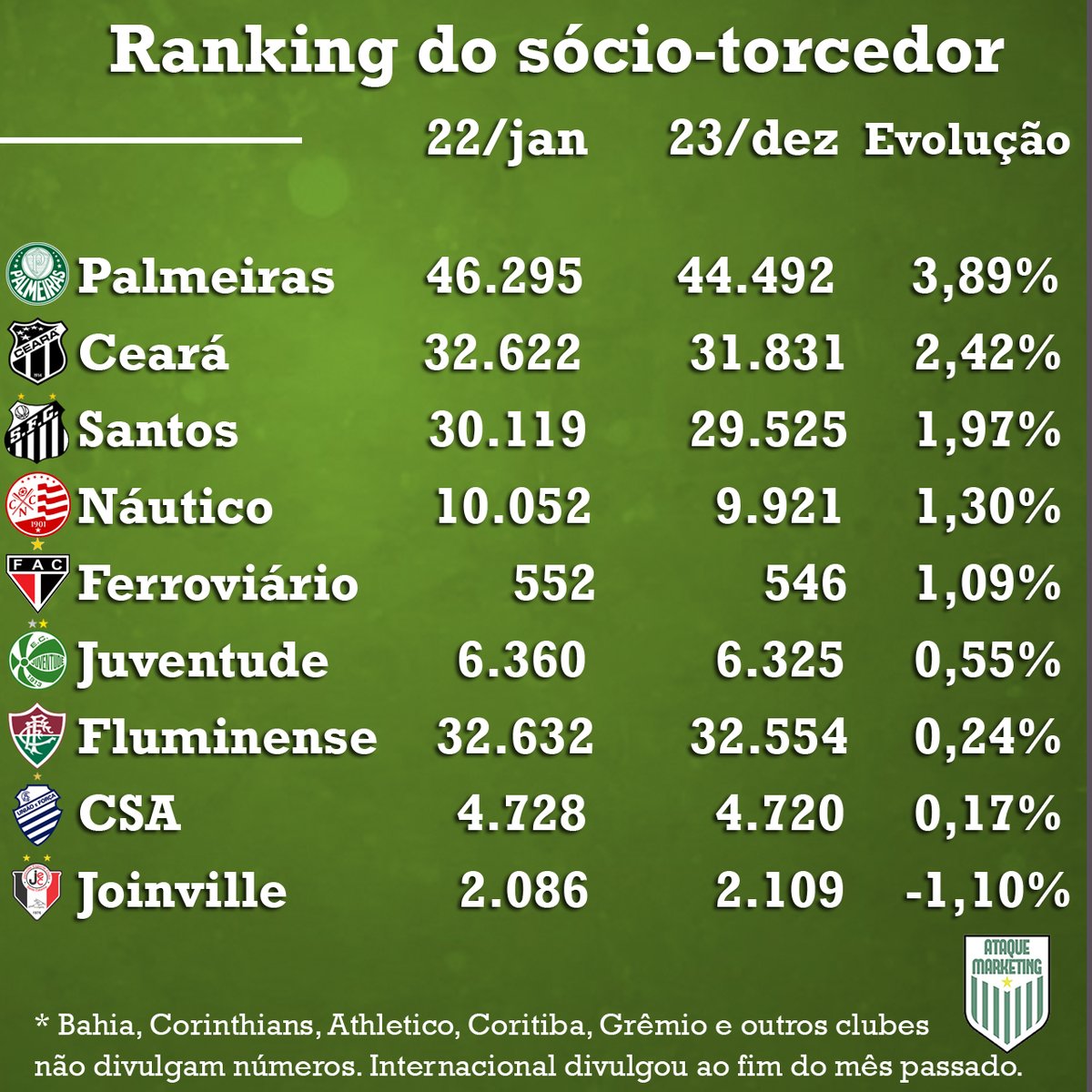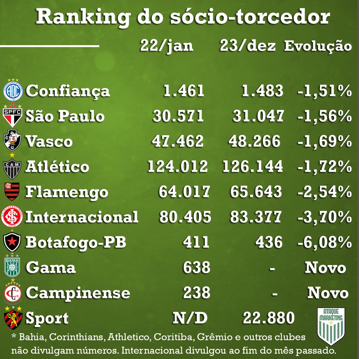 ▪️ Corinthians, Bahia, Grêmio, Athletico, Coritiba, América-MG, Cuiabá, Atlético Goianiense... nenhum deles divulga números.