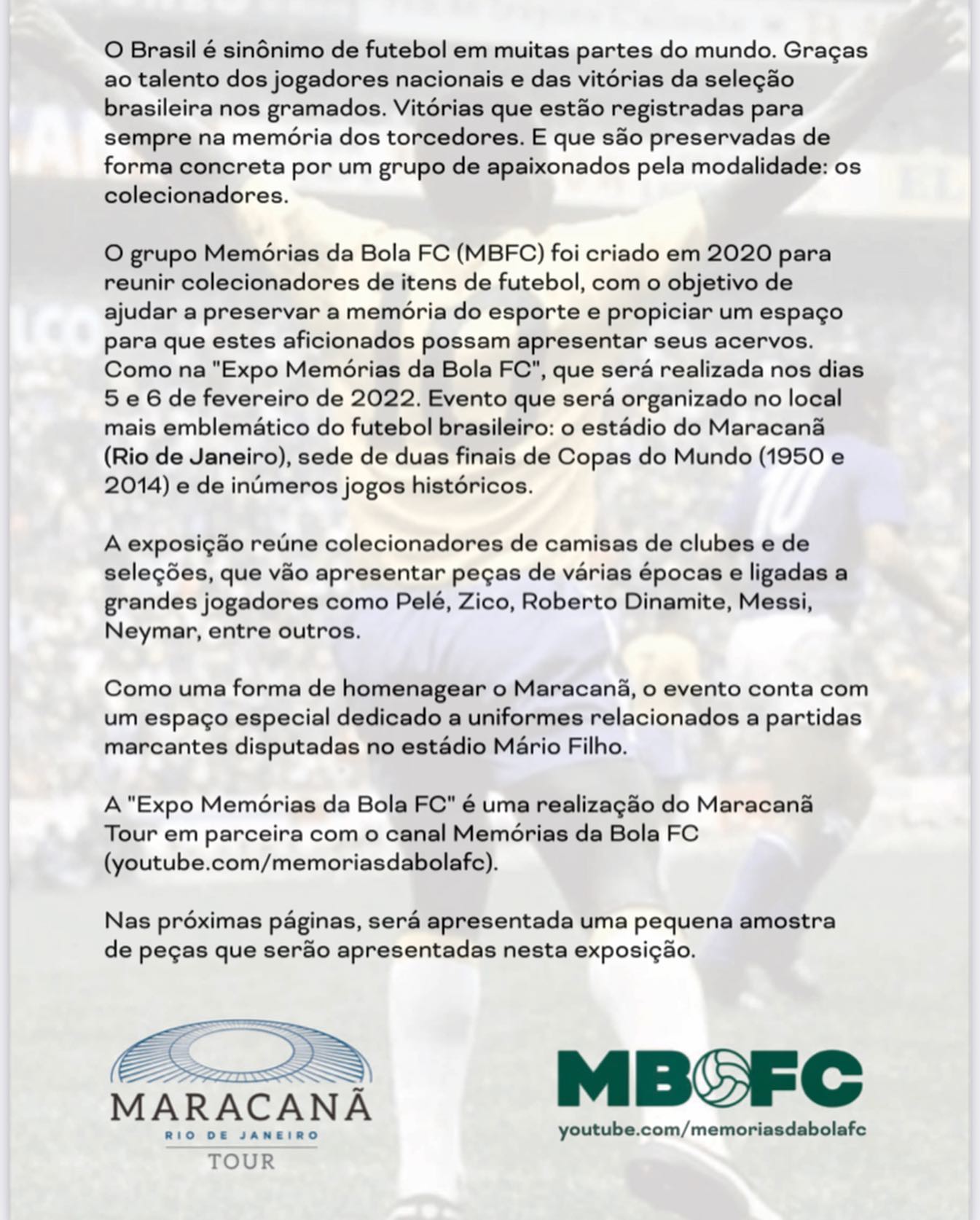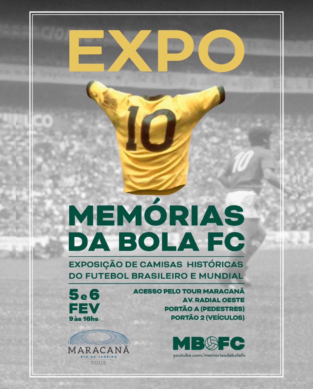 Então se você estiver ou vier ao Rio de Janeiro no primeiro final de semana de fevereiro, você tem um programa imperdível: visitar a "Expo Memórias da Bola FC" no Maracanã. No dias 5 e 6 de fevereiro, das 9h às 16h. E não deixe de se inscrever no Memórias da Bola FC, que fará uma cobertura completa da exposição. Clique no link da bio do @memoriasdabolafc e inscreva-se (é grátis)