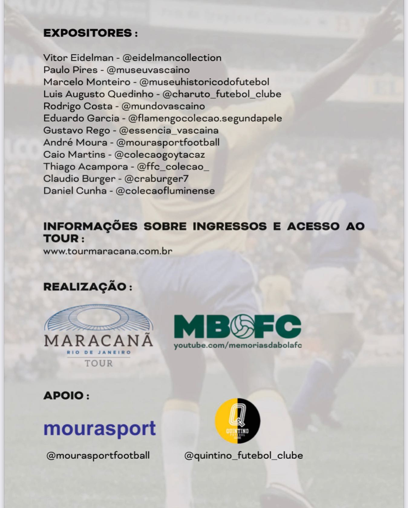 O evento é uma realização do Maracanã Tour (www.tourmaracana.com.br) em parceria com o canal Memórias da Bola FC (youtube.com/memoriasdabolafc).