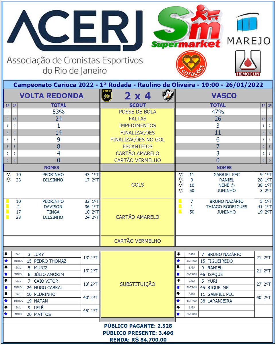 O Vasco foi dominante no primeiro tempo e abriu 3 a 0 após gols de Gabriel Pec, Raniel e Nenê. O Volta Redonda diminuiu com Pedrinho, de pênalti, antes do intervalo. Na etapa final, os cruzmaltinos ampliaram com Juninho. O Voltaço marcou mais um, com Dilsinho.