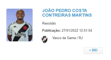 Rescisão de João Pedro com o Vasco é publicada no BID