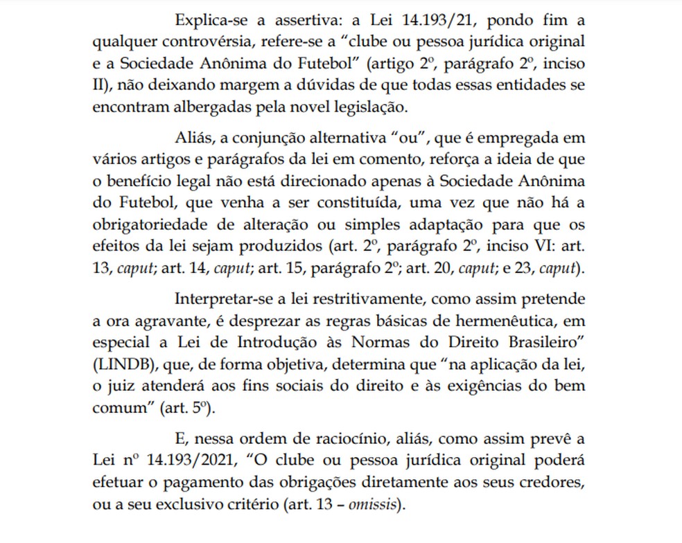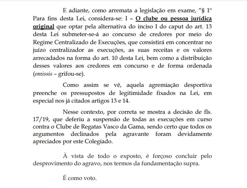 Para o Departamento Jurídico do Vasco, essa foi uma decisão importante porque confirma o entendimento de que a lei não exige a constituição de uma SAF para que o clube tenha acesso ao RCE.