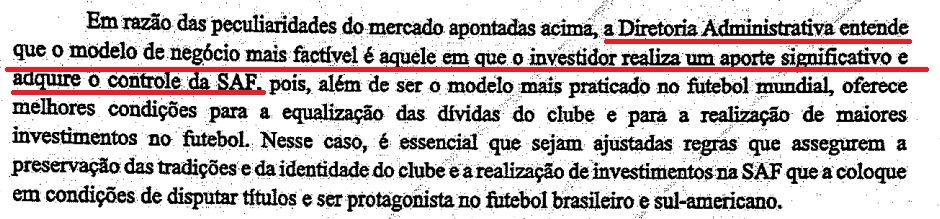 Posteriormente, nas entrelinhas, o recado definitivo sobre os objetivos finais dessa gente é oferecido em bandeja de prata. O que eles pretendem não é negociar um pouquinho, ficar com um tantinho, ou coisa que o valha. Eles querem VENDER o clube e não deixam dúvidas. A retórica é miserável, mas não poderia ser divergente da vontade.
