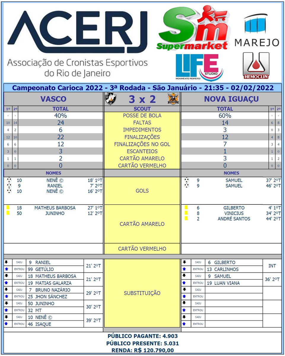 Cartões amarelos: Matheus Barbosa e Juninho (Vasco); Gilberto e Vinícius (Nova Iguaçu)