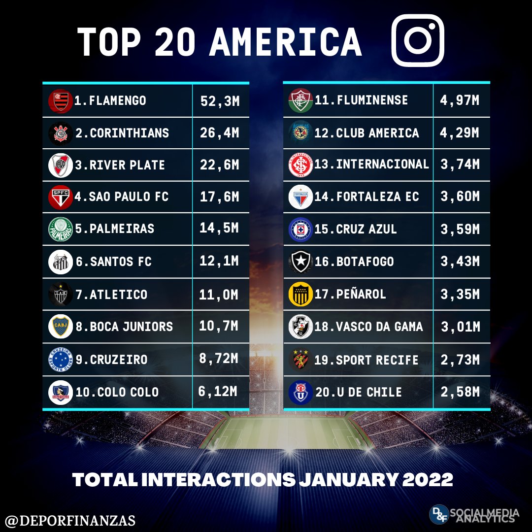 📲⚽ ¡Los 20 clubes de América con más interacciones en #instagram durante enero 2022!💙💬