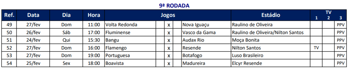 De acordo com a atualização da tabela da Taça Guanabara divulgada no site da FFERJ, Fluminense x Vasco, pela 9ª rodada, será no dia 26/02, sábado, às 17h. Apenas o local está indefinido entre o Raulino de Oliveira, em Volta Redonda, e o Engenhão.