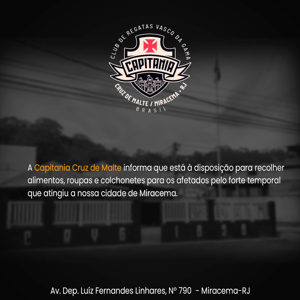 Vasco divulga campanha de Capitania pelas vítimas das fortes chuvas em Miracema-RJ
