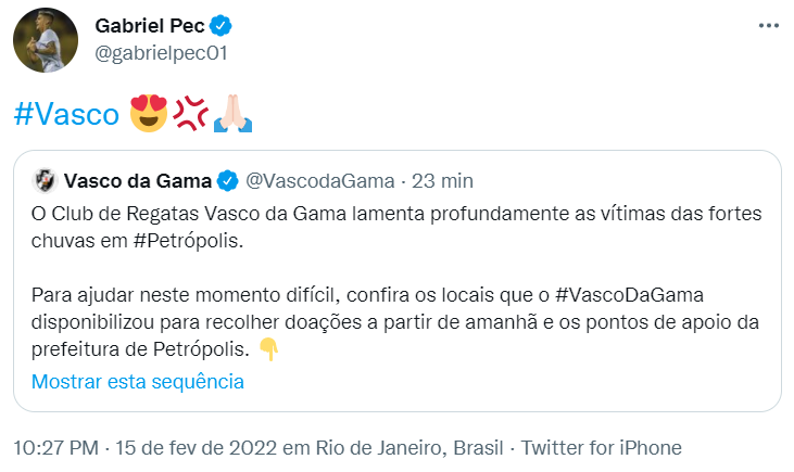 Fonte: Twitter do jogador Gabriel Pec, Twitter oficial do Vasco