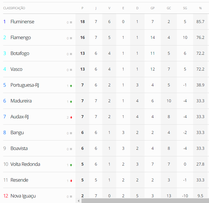 Veja a classificação da Taça Guanabara após os jogos de 4ª-feira; Vasco está em 4º lugar