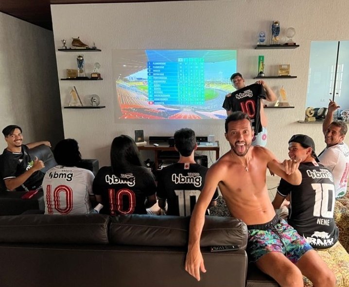 Suspenso, Nenê reúne amigos para assistir a Audax x Vasco pela TV; veja foto