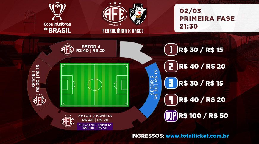 O torcedor da Ferroviária que desejar ficar no setor VIP do estádio vai ter que desembolsar o valor de R$ 100 inteira e R$ 50 meia. Já os vascaínos que quiserem acompanhar a partida, no setor visitante (Ferrão do Fundo), os ingressos custam R$ 30 e R$ 15.