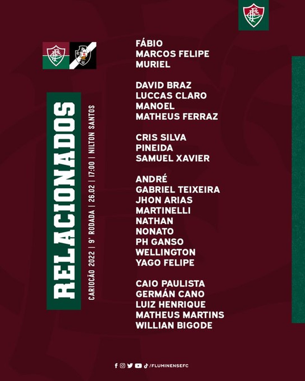 Quem já estava fora do clássico desta tarde era o atacante Fred. O camisa 9 teve uma lesão na coxa durante o jogo de ida contra o Millonarios, na última terça. Com isso, o argentino Germán Cano foi relacionado e vai encontrar o ex-clube pela primeira vez. Porém, justamente por causa da partida de volta contra a equipe colombiana, a tendência é de que ele comece no banco de reservas para ser preservado.
