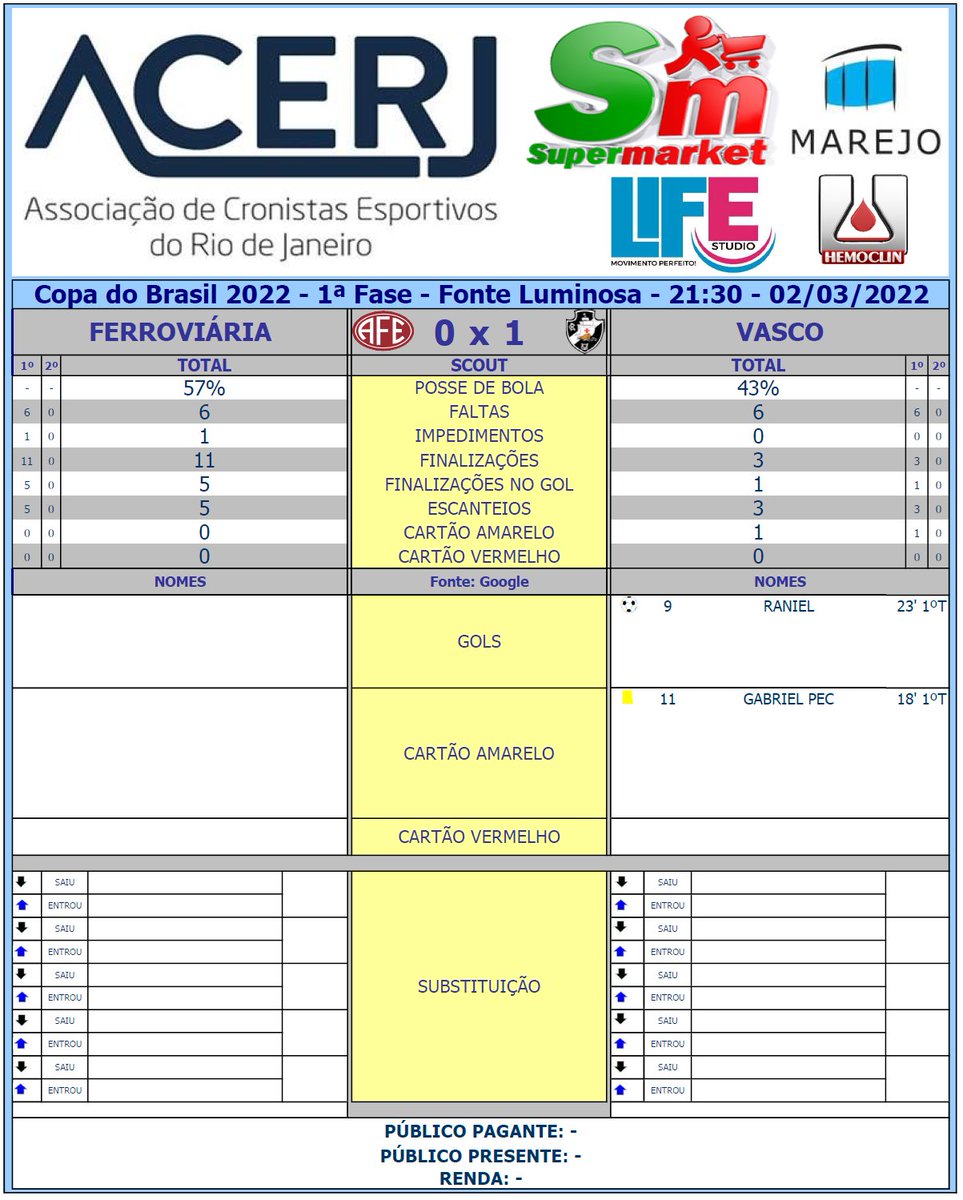 Scout do 1º Tempo de Ferroviária e Vasco pela 1ª Fase da Copa do Brasil 2022 na Fonte Luminosa #Acerjinforma #CopaIntelbrasDoBrasil #FERxVAS #AFExVAS #Ferroviaria #VascoDaGama @CopadoBrasil @afeoficial @VascodaGama