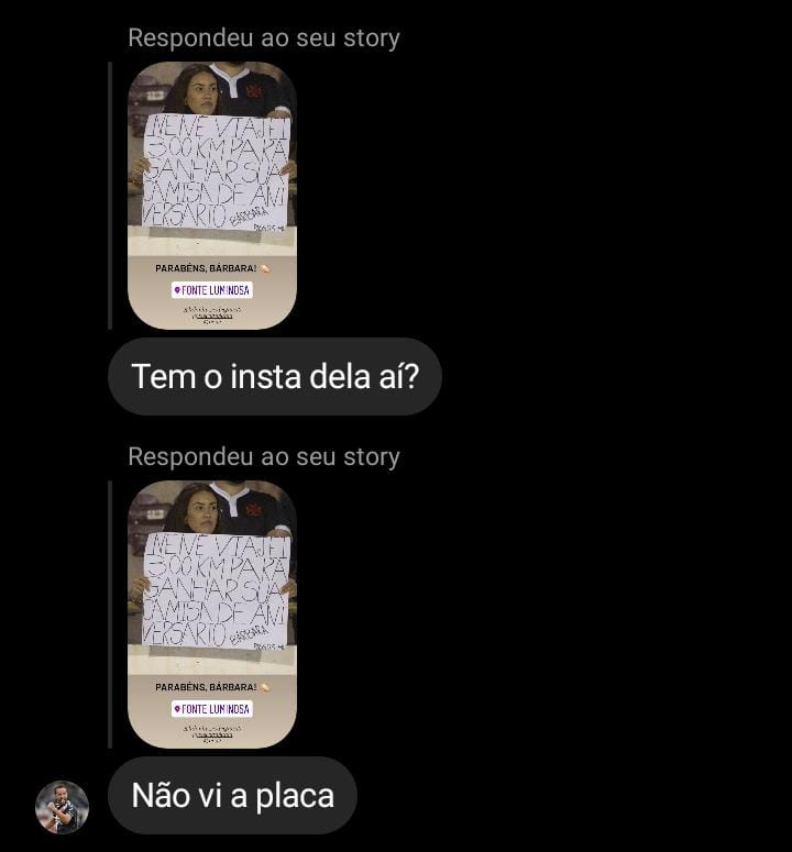 Bárbara não conseguiu a camisa utilizada pelo Nenê na partida desta noite, mas o filho do capitão vascaíno, Lucas Rodrigues, que estava na Fonte Luminosa e a viu com a placa na arquibancada, lhe presenteou com uma camisa do Vasco que estava no carro. ❤️💢