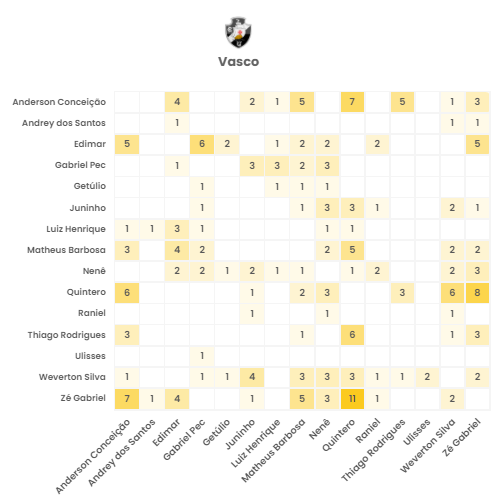 Confira o mapa de interações de passes dos jogadores do Vasco no jogo contra a Ferroviária