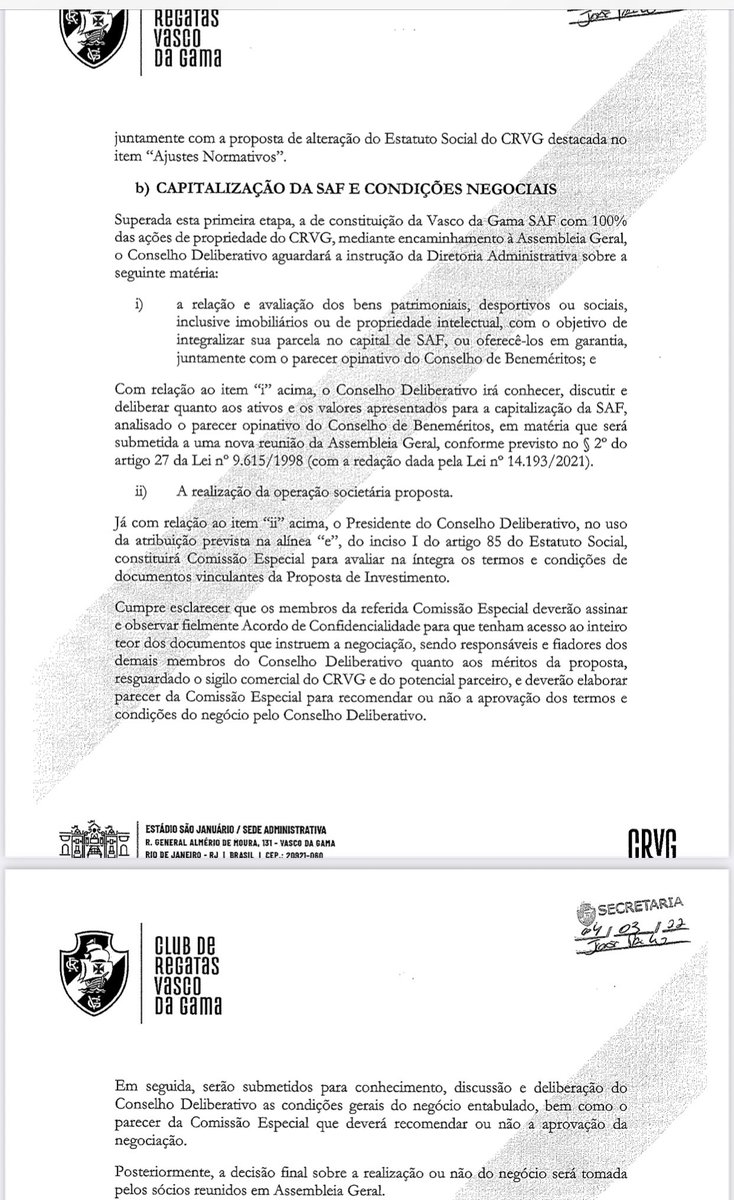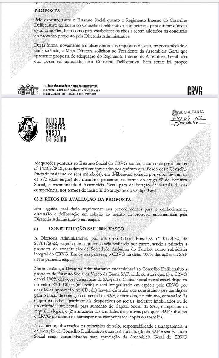 Na proposta, a primeira Assembleia Geral será para o sócio votar dois itens: a proposta de constituição da SAF 100% do Vasco e uma alteração tópica no estatuto do clube onde se deixará expressa tal condição se o Cruzmaltino criar uma SAF.