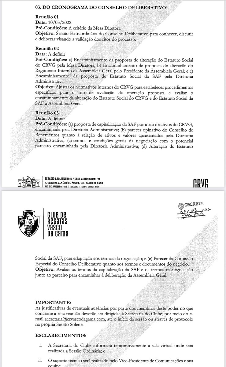 Após a aprovação de um empréstimo-ponte de R$ 70 milhões da empresa 777 Partners - interessada em gerir a SAF do clube - o presidente do Conselho Deliberativo do Vasco, Carlos Fonseca, convocou uma nova sessão extraordinária para o próximo dia 10, a partir das 18h30, desta vez com o intuito de conhecer, deliberar e discutir sobre os ritos a serem seguidos pelo órgão e pela Assembleia Geral visando a tramitação da proposta de constituição da Sociedade Anônima do Futebol.