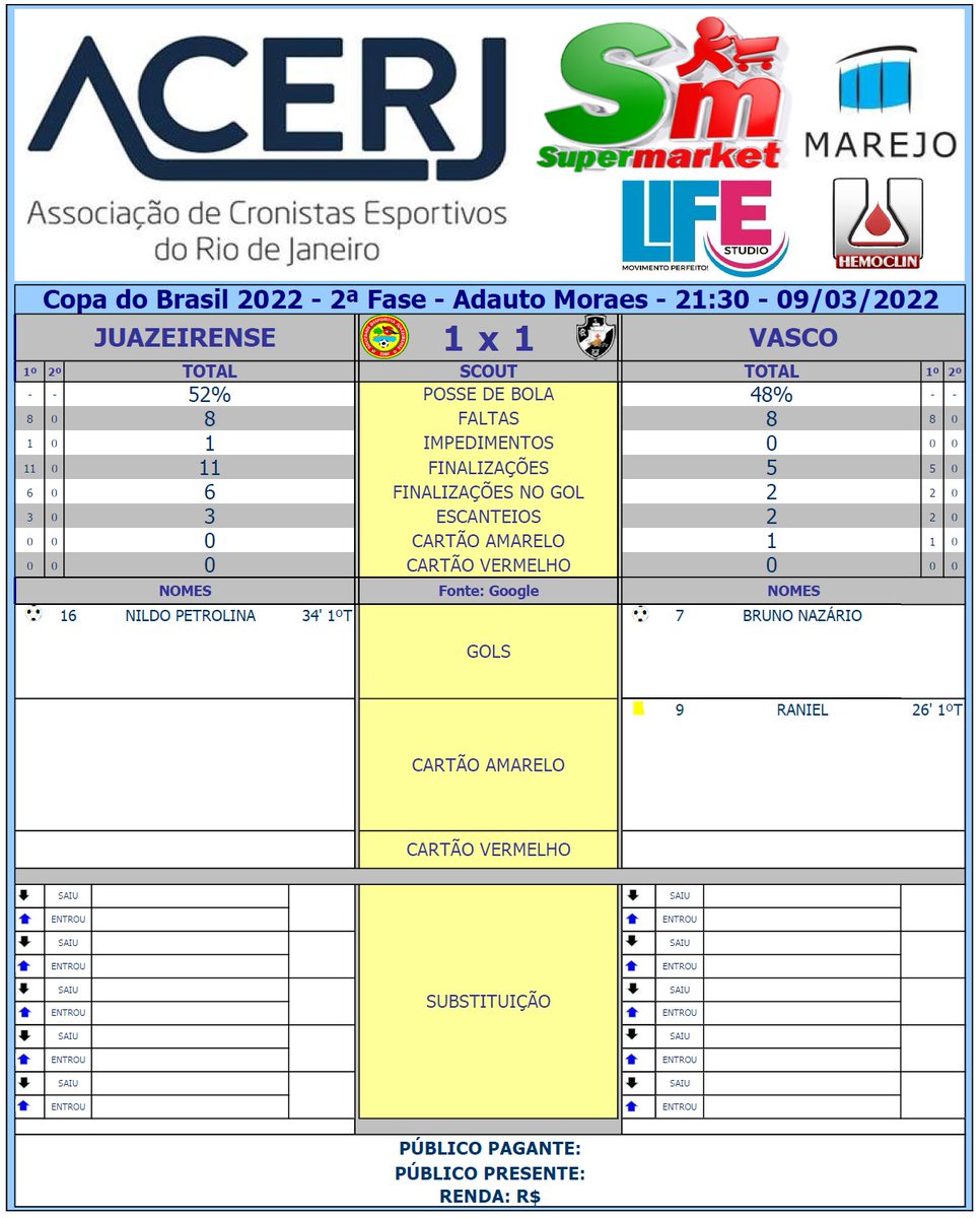 Scout do 1º Tempo de Juazeirense e Vasco pela 2ª Fase da Copa do Brasil 2022 no Estádio Adauto Moraes #Acerjinforma #CopaIntelbrasDoBrasil #JUAxVAS #Juazeirense #VascoDaGama @CopadoBrasil @Juazeirenseba @VascodaGama