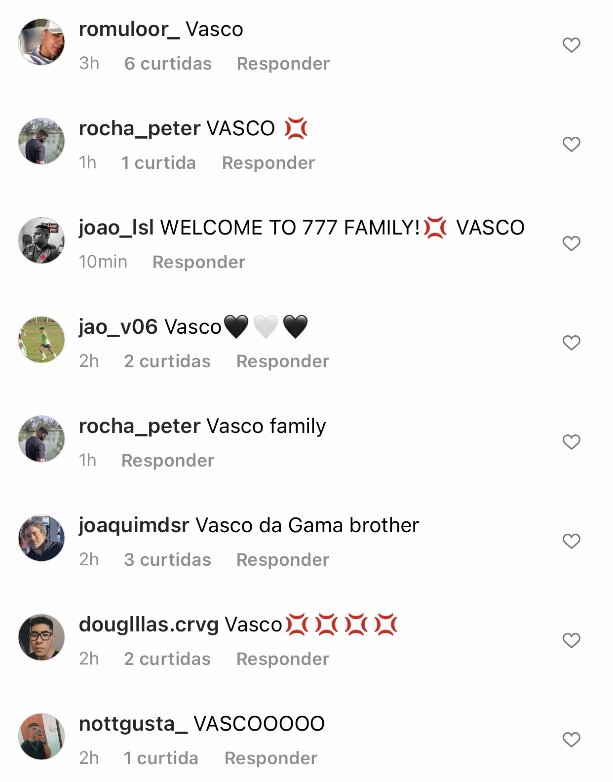 "Bem-vindos à família 777", "Welcome, Papai" e "Vasco, brothers" foram alguns dos comentários em tom descontraído.