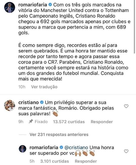 Cristiano Ronaldo quebra marca de Romário e ganha elogio do Baixinho