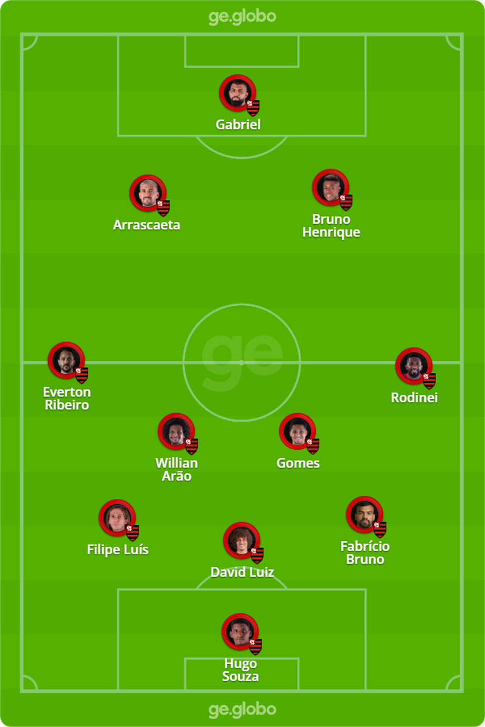 Provável escalação: Hugo, Fabrício Bruno, David Luiz e Filipe Luís; Rodinei, Willian Arão, Gomes e Everton Ribeiro; Arrascaeta e Bruno Henrique; Gabigol.