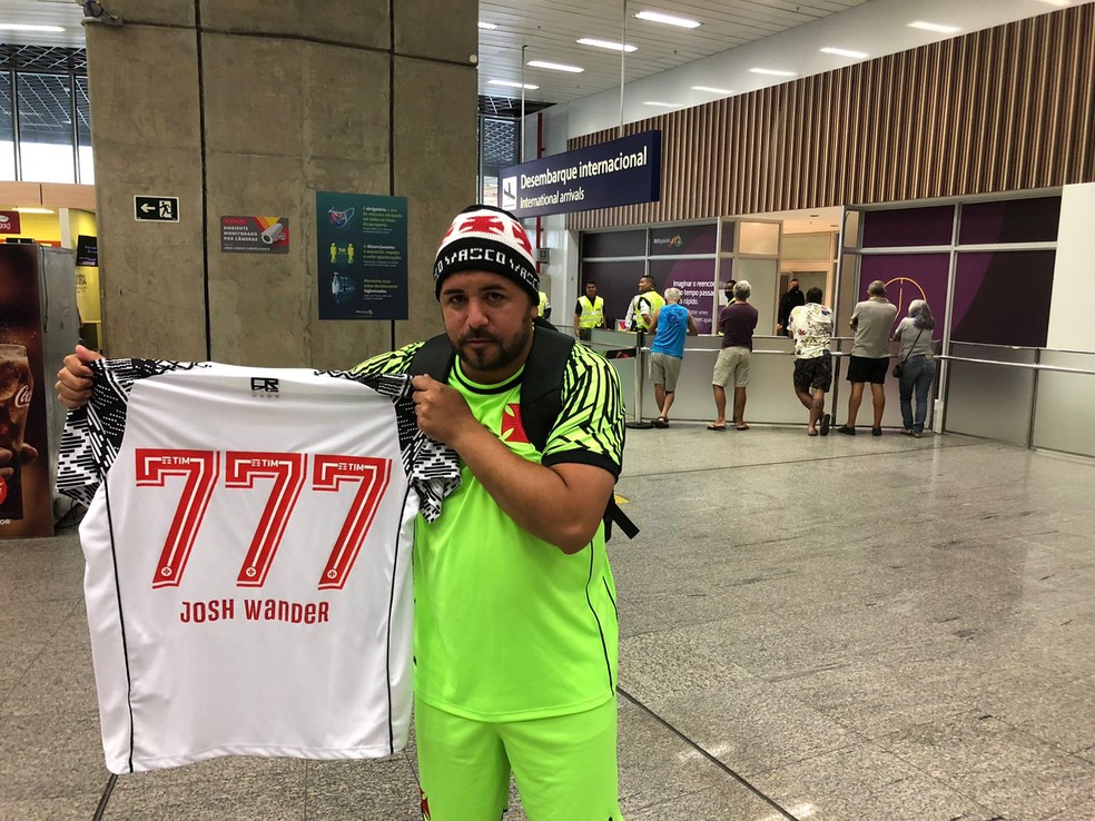 Com seguranças e carros contratados para a saída do aeroporto, eles ouviram ligeiro apelo de um dos torcedores presentes. Lucas Chagas, de 18 anos, cumprimentou e pediu em inglês a Josh Wander: