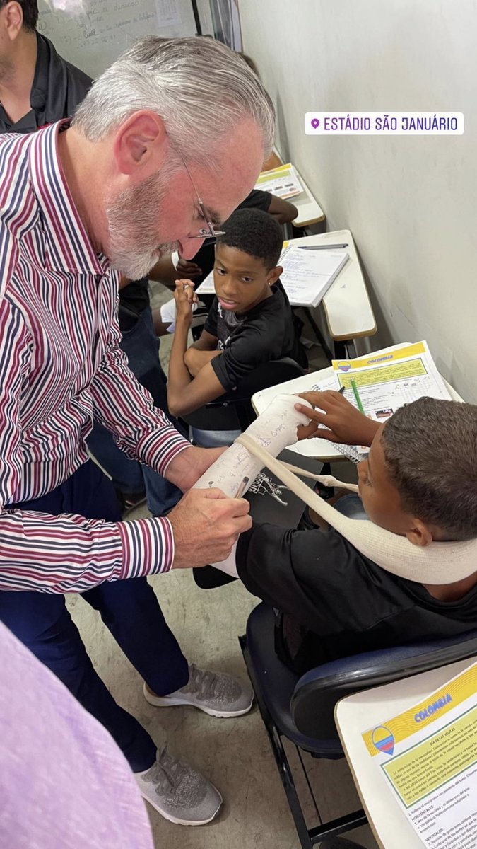 Aluno do Colégio Vasco da Gama recebeu autógrafo de Steven Pasko, fundador da 777, em seu gesso