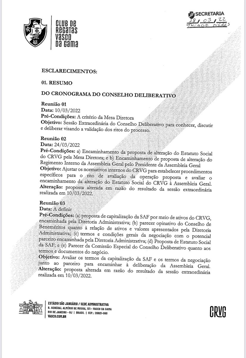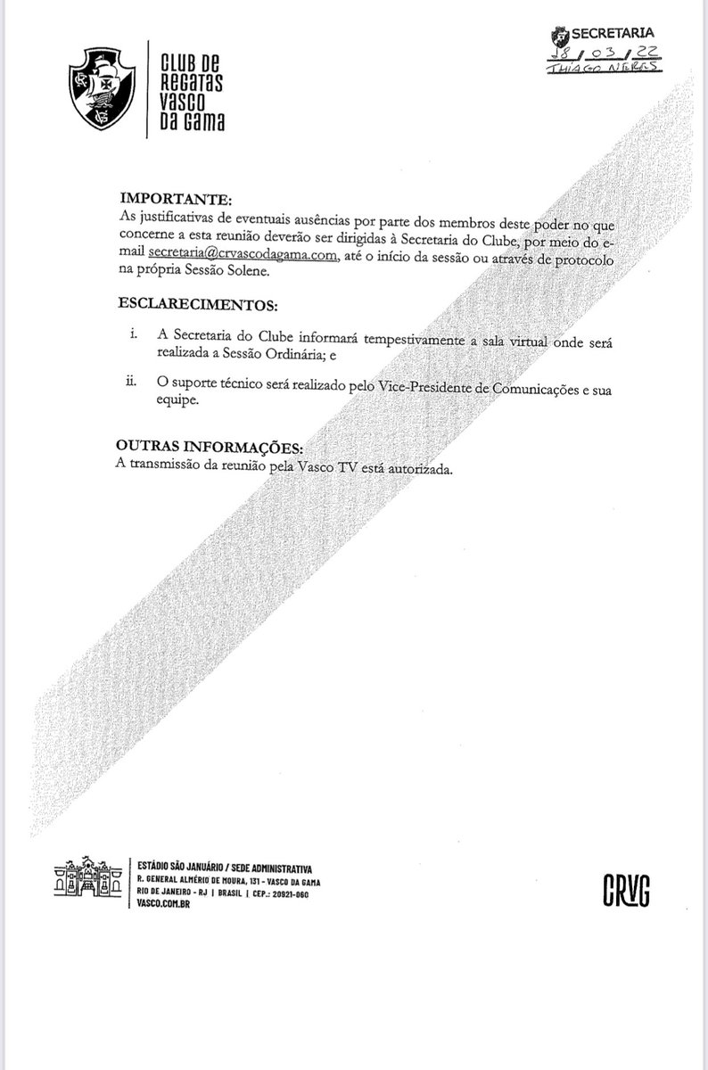 Presidente do CD autoriza transmissão da reunião da próxima 5ª-feira pela VascoTV