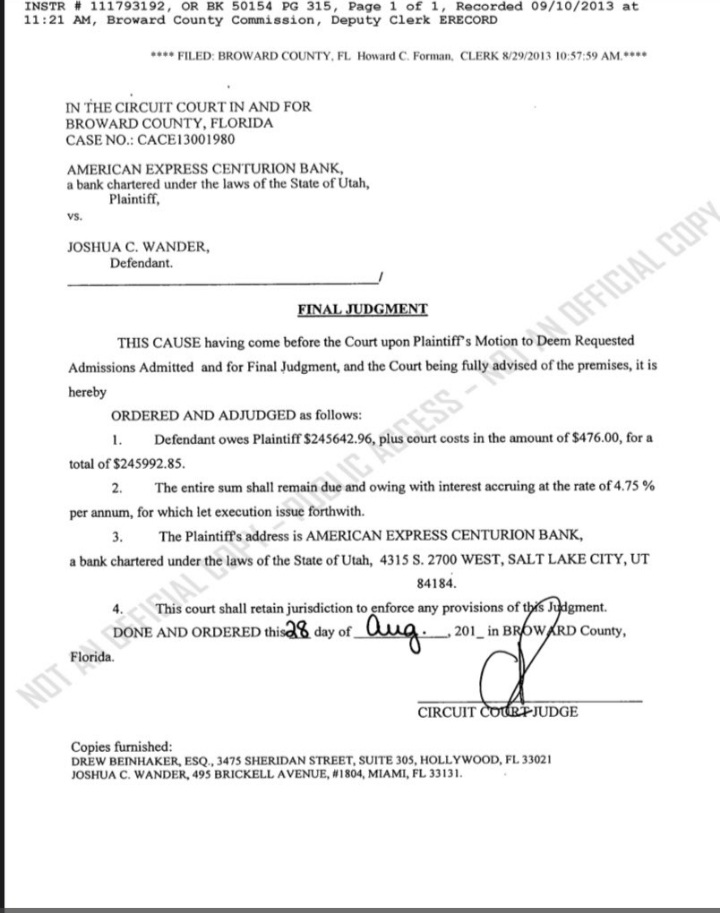 Ocorre que o sr. Joshua, neste período relativamente complicado da sua vida parece ter adquirido um patrimônio relevante, o que sugere incompatibilidade com a situação vivida. A ponto de, pessoalmente, dever 250 mil dólares a uma empresa de prestação de crédito: