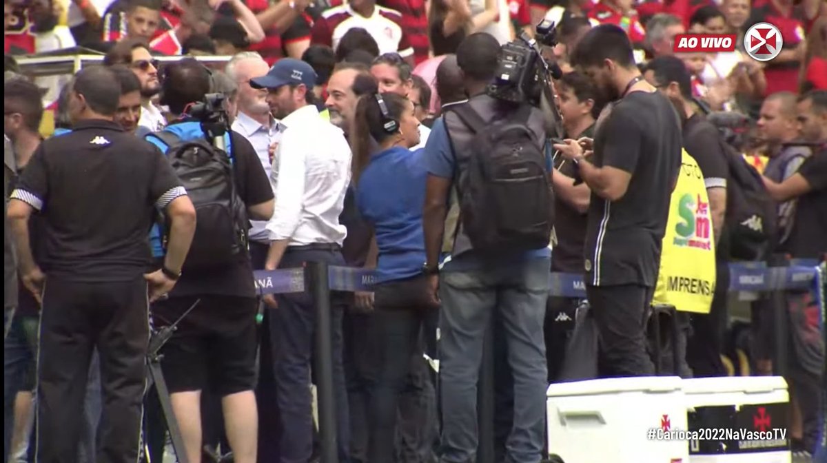 Executivos da 777 Partners estão à beira do gramado do Maracanã rodeados pela imprensa. O presidente Jorge Salgado e o VP Carlos Osório também se fazem presentes.